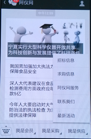 1、我是供應(yīng) 菜單功能有:招標(biāo)信息、求購(gòu)信息、阿儀網(wǎng)服務(wù)、聯(lián)系我們、最新活動(dòng)
